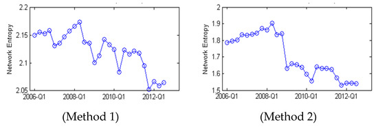 Figure 4 presents the time variations of the network entropies of foreign claims. The left panel of Figure 4 represents the network entropies computed by Method 1, and the right panel depicts the network entropies calculated by Method 2. Note that the network entropy obtained from Method 2 dropped sharply from the first quarter of 2009, while the network entropy from Method 1 experienced only moderate changes compared to Method 2. Figure 4 illustrates the point that Method 2 may better detect changes in network structures since it incorporates changes in the centrality of nodes, whereas Method 1 does not.