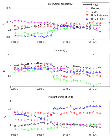 Table 1 provides a more comprehensive perspective of the components of network entropy by providing snapshots for four periods. Table 1 includes the periods 2008 Q2 and 2009 Q1 for comparison in addition to the starting and ending periods of the sample. From Table 1, it is evidenced that in addition to France and Germany, the eigenvector centralities of Belgium and Netherlands also declined sizably during the sample period. Regarding the entropies, it is interesting to note that only the entropies of Greece and Italy decreased between 2006 Q1 and 2008 Q2. Finally, the invariant probabilities of Belgium, Austria, and Italy, in addition to France and Germany, diminished during the sample period reflecting the European debt crisis, which implies that the importance of these countries in international borrowing decreased. Overall, the analysis of the components of network entropy provides a detailed picture of how the network structures of the global financial markets evolved during the financial crises.
