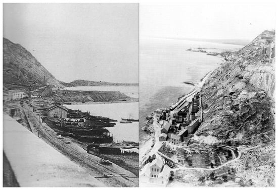 The refinery grew as the country required its services due to the increase in population. At the beginning of the 20th century, it supplied 55% of the Spanish market to be used for, among other uses, public lighting and both civil and military vehicles. In 1903, an enormous delimiting wall was erected for the factory, as seen in the photos of the time (Figure 4). In 1915, the refinery was linked to the railroad. In 1929, the pier was destroyed by a storm and was not rebuilt to link to the factory.