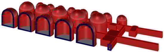 The enclosure consisted of three main galleries and seven secondary galleries, linked in a grid pattern that housed large concrete vaults on their sides in which metal tanks were installed to store the crude oil. The main vaults were approximately 20 m high and 18 m in diameter. The communication galleries had average dimensions of 3 m by 2 m in height and a length of approximately 160 m. The layout can be seen in Figure 7, showing 10 main and 16 secondary vaults. The total footprint of the subterranean facility is located in a rectangle of 170 by 120 m.