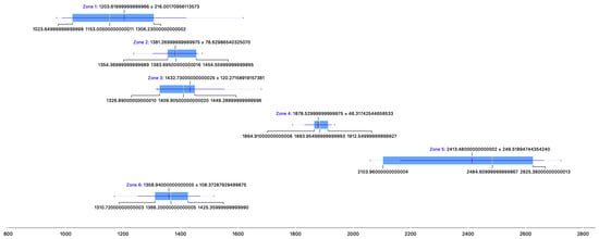 Chart showing the dispersion of the results obtained in the six measurement zones (own source).