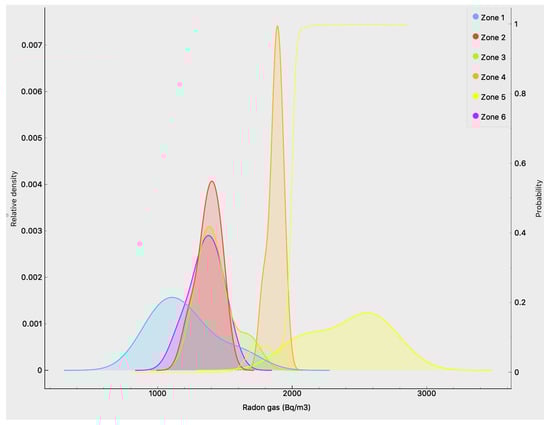 In Spain, the most valuable source of environmental radiological information is the Natural Gamma Radiation Map (Marna) []. The Marna evaluates the rate of exposure to terrestrial gamma radiation of natural origin referenced to one meter above ground level, which has an excellent correlation with the content of radium-226, which is the precursor isotope of radon. Because the currently available network of radon measurements in homes is not dense enough, the Marna offers a good alternative for developing a radon exposure predictive map.