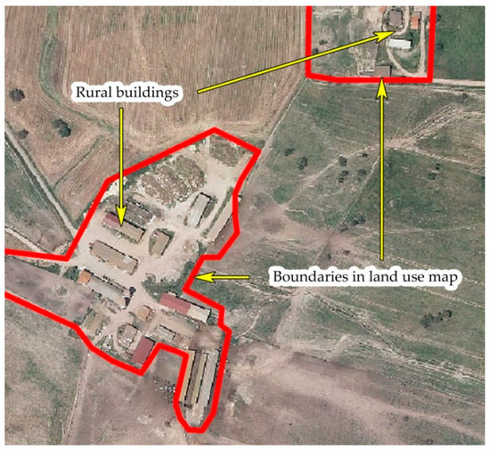 Example of representation offered by the regional land use map: The red boundary line includes an area that comprehends both rural buildings and their unbuilt surrounding areas.