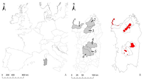 Geographic context. (A) In gray, the region of Sardinia. (B) In gray, the landscape units (LUs); in red, the Natura 2000 sites included within the LUs.