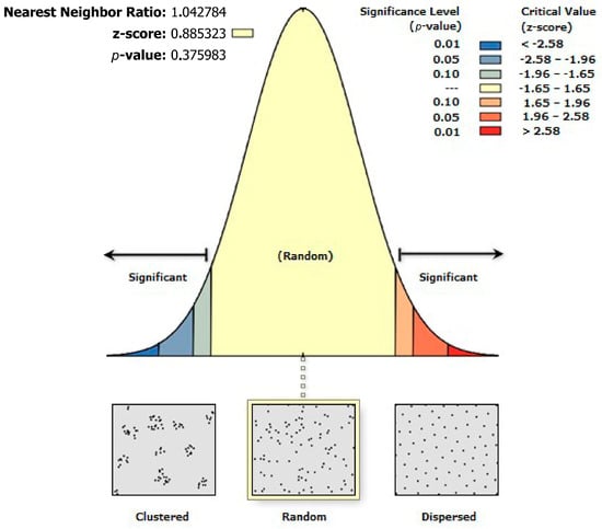 When NNR is greater than 1, the spatial pattern can be resembled to a dispersed type. Values of NNR smaller than 1 indicate a clustered spatial pattern.