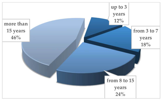 Data presented in a graphic form in Figure 1 make it possible to notice that almost half of all the service providers have been operating on the market for over 15 years. Less than three years of operation of the entities were the least numerous group.