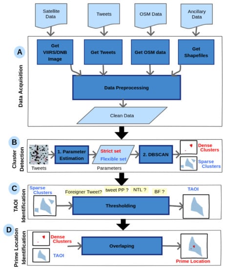 In this section, we propose a framework devised to identify and map TAOIs from the subset of geo-tagged tweets. Our methodology consists of three main parts: data acquisition, cluster detection and TAOI identification as shown in Figure 1. Nighttime light satellite images, geo-tagged tweets, OSM data, and other ancillary data sets such as shapefiles are collected and used to identify TAOIs.