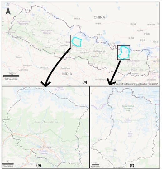 Map highlighting selected study areas in Nepal: (a) Nepal map, (b) Kaski district map and (c) Solukhumbu district map).