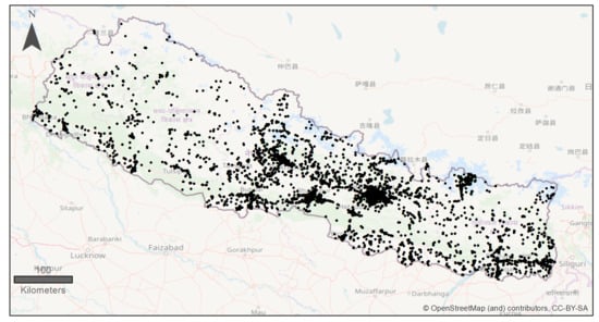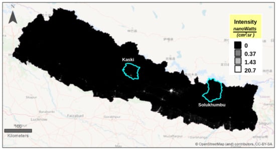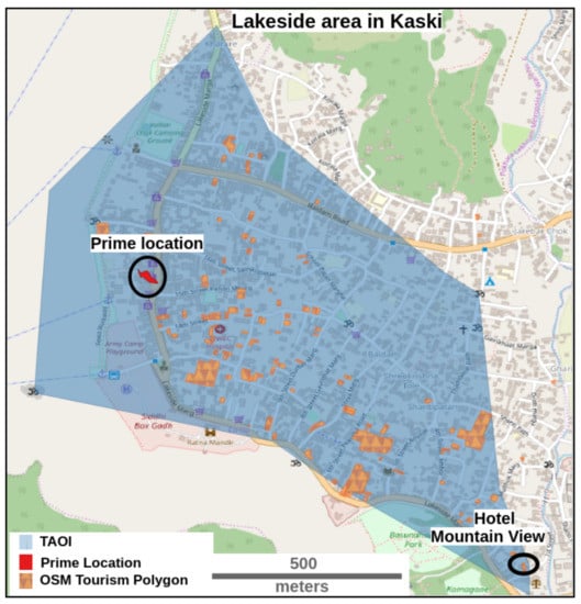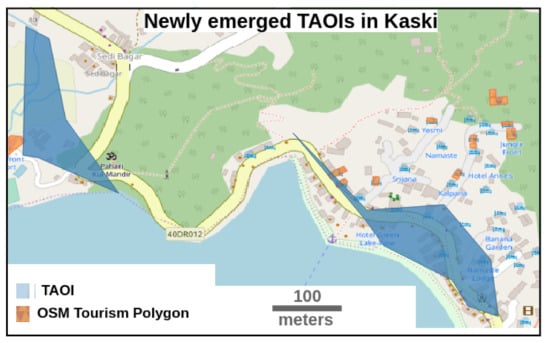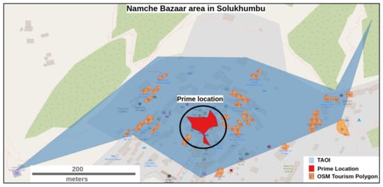 Our research differs from previous works in several aspects. Many studies have used social media data from sources such as Flickr, Panoramio, FourSquare, Gowalla, Sina Weibo, etc. in different domains. However, to date most research has concentrated on attempting to derive the important AOIs and attractions of given regions, assuming the availability of social media data in abundance. Few of the works have used geo-tagged tweets and mainly focus on exploring urban AOIs and places. Limited work has been done to explore the area of interest in remote places and places with relatively less social media reach. Also, we came across many studies that use some sort of spatial clustering algorithm that requires some hyperparameters such as search distance. Though some of them have proposed ways to estimate or automate such parameters, they rely on some specific assumptions which are not suitable for our case (to be discussed in upcoming Section 3.2.1) []. To our knowledge, none of them suggest an easy way to automate the estimation of such parameter values which can work across different scarce data regions. However, we proposed a way to estimate such parameters for identifying TAOIs and prime locations. Furthermore, the recommended approach not just discovers TAOIs but also examines the accessibility to minimum essential facilities. We examined the proposed approach in sparse data regions in Nepal and further refined the results by using the freely available data from OSM and NTL. Hence, the proposed method is novel, and it encourages the discovery of TAOIs by fusing freely available data from VGI and remote sensing.
