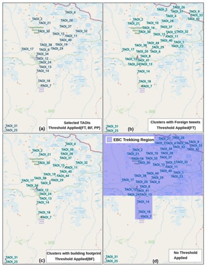 While active cluster regions have been extracted based on tweet density, the TAOIs of each region remains vague. This section aims to explore the extracted clusters and characterize them as TAOIs. Related studies have used geo-tagged social media data for mining tourist locations without separating the data from local and non-local users [,]. Also, previous studies in the proposed area (i.e., Nepal) illustrated that approximately one third portion of the tweets was contributed by non-local users []. Hence, to avail more input for the underlying clustering algorithm, the proposed approach makes use of the tweets posted by both local and non-local users in the beginning. Later, a strict requirement is imposed so that foreign user tweet must be present in the selected TAOIs. Twitter user profile information is examined to confirm if the tweets are published by local or foreign users. False user profile information can degrade the location inference; however, several past studies have used such data as a source for ground truth in their studies [,]. Jurgens et al., experimentally illustrated that there are not so many false location information []. Furthermore, recent studies have indicated that NTL data is highly correlated with urban infrastructures and socio-economic activities such as tourism [,]. Therefore, regions with either enough BF (or enough NTL intensity) are assumed to ensure minimum infrastructure necessary for tourism activities. Also, it has been observed that higher tweet percentage is associated with active tourism areas. Hence, the following criteria are defined to distinguish TAOIs from ordinary tweet clusters: