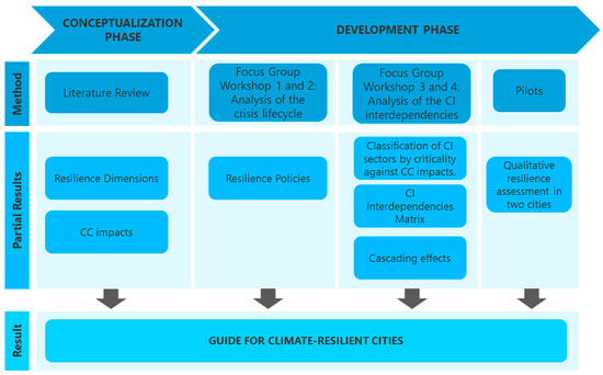 The objective of this research was to develop a guide to help cities to improve their resilience level against CC taking into account their urban CIs. Figure 1 shows the overall research methodology used in the research, which consisted of two phases: the conceptualization phase and development phase. The outcomes obtained in each phase contributed to the development of the resulting resilience guide.