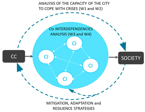 Urban CIs form complex and strongly interconnected networks that are affected by CC impacts [35,36,37]. In this sense, interdependency relationship analysis among CIs is a cornerstone for a reliable, safe and secure CIs system operation that ensures the critical services, even in the case of major disruption, as interdependencies are the cause of many indirect impacts and cascading effects [38,39]. Furthermore, interdependencies among CIs can be determinant for the recovery phase of a crisis and must be taken into account [40,41].