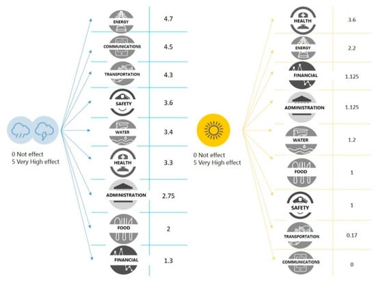 To illustrate, Figure 4 shows the results of the study carried out in one of the analysed cities. On the left is the effect that a severe chain of squalls has on urban CIs and on the right is the effect that a heat wave has on urban CIs. The numbers represent the average of all the experts’ answers.