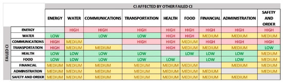 The guide developed proposes using a matrix to analyse the level of interdependencies [38]. The proposed matrix establishes the effect of one CI failure on other CIs, by defining three degrees of dependency: low, medium and high. Moreover, it is useful to establish a temporal range of autonomy before the dependency becomes critical. This information is relevant for decision makers in order to establish appropriate auxiliary measures to limit or completely remove the negative effects of those dependencies.