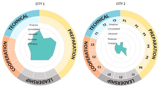 Based on the results, it can be seen that City 1 has a higher resilience level than City 2, as the degree of implementation of the resilience policies is, in general, bigger in City 1 than in the City 2. This is due to the fact that the bigger city, City 1, has more resources and more autonomy than the smaller one, City 2. In this sense, City 1 is familiar with the concept of resilience and already has a CC adaptation action plan, as can be seen in the values of the policies for the leadership and preparation dimensions. Moreover, they have carried out projects to understand their urban CIs and their interdependencies, as the technical dimension analysis shows. In contrast, for City 2 resilience is a new approach, and although they are aware against CC impacts, they are starting to design their strategy to deal with its effects, as can be seen in the analysis of the leadership and preparation dimensions. In the case of City 2, the technical dimension analysis reflects the fact that they have little knowledge about the CI sectors and their interdependencies, being a simply user-provider relationship. In the cooperation dimension, both cities have a big area of improvement, being bigger in the case of the smaller city. In this sense, the participants of City 2 pointed out that cooperation at different levels was paramount for them to solve crises, as they depend on external resources at the regional level. The study reflects this situation and suggests that for smaller cities the resilience strategy might need to be developed at the county or regional level to be more effective, considering a group of municipalities.