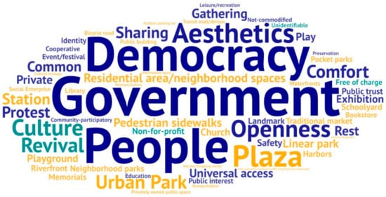 Table 2 shows the results for how spatial publicness is conceptualized in accordance with the coding scheme. This illustrates many similarities with the attribute of public space. Since many articles were related to introducing new projects initiated by institutions, “government” (475 times, 23.0%) was the most commonly cited keyword within the attribute category (Figure 1). “People” (368 times, 17.84%) was the second-most commonly cited word. The results of “business complex” (n = 21, 2.29%), “market/shopping center” (n = 12, 1.30%), “24 hours operation commerce/coffee shop/fast food restaurants” (n = 4, 0.43%), and “intermediate space” (n = 3, 0.32%) framed publicness in space as more related to accessibility than ownership. For example, “…[a]n example of public space is a large shopping center connecting the ground and the underground”[84]. As the influence of burgeoning of garden projects in South Korea, “pocket park” (n = 24, 2.61%), “outdoor parking lot” (n = 9, 0.98%), “community garden” (n = 3, 0.33%) framed public spaces as created by community-led efforts; “… [t]he well-kept gardens remained in the private space of rich people… But the experiment of pocket park is breaking this stereotype. The garden entered the city and began to turn into a public space with publicness” [85]. Profitability was framed in a manner that contrasted spatial publicness; “non-for-profit” (n = 32, 14.10%) and “free of charge” (n = 29, 12.78%), was closely related to publicness.