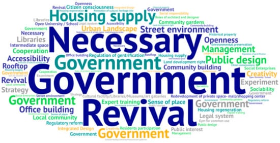 Contents discussed in the articles about ways to improve spatial publicness can be divided into five categories: (1) increasing the open space for the public; (2) preventing unsustainable developmental projects; (3) participation of residents and enhancing the roles of professionals; (4) improvement of publicness with public design; and (5) others (See details in Table 5). Among the categories in this theme, discussions of improving spatial publicness alluded to “government” most frequently (227, 111, 65, 72 and 22 times, respectively) (Figure 3). “Necessary” was the second-most commonly cited concept in relation to increasing open spaces for the public and publicness of the private space (164 times). The articles discussed mainly about the “government,” describing where the government conducted, or should conduct, “necessary” projects to enhance spatial publicness. For example, “…the government has a plan to create a place for people where publicness should be premised…”[93].