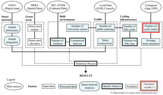 | Cyclist’s behaviour | 1. Flow (n) | [11,12,22] | nº of cycling routes (GPS) passing through the green area plus a 100 m buffer zone surrounding it. |