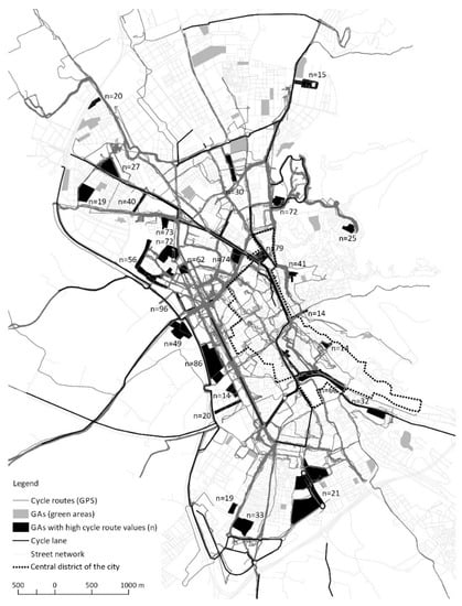 | Cycling infrastructure | 13. Bicycle racks (n) | [21,35,36] | Bicycle racks in each green area +100 m buffer. |