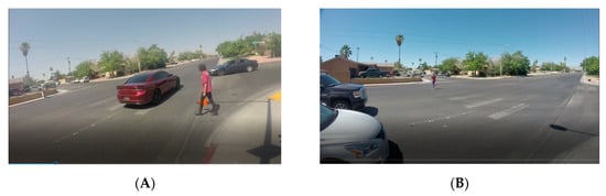 (A) Example of vehicle failing to yield while the pedestrian is in the roadway. (B) Example of vehicles yielding to the pedestrian crossing the roadway at a midblock crosswalk in Las Vegas, NV.