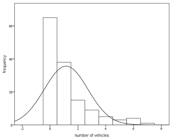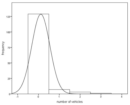 Histogram of number of vehicles that passed through the crosswalk while the pedestrian was in the same half of the roadway.