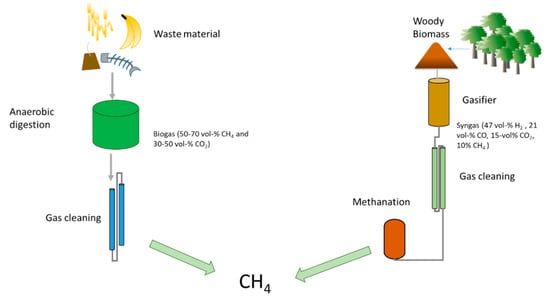 Syngas typically contains contaminants such as tars, solid particles and acids, which must be removed before further processing. Cleaning methods usually include cyclones, wet scrubbers and catalytic steps [56,57]. H2 and CO as well as CO2 from the syngas can be further reacted to CH4. The overall reactions can be simplified as Equations (2) and (3):