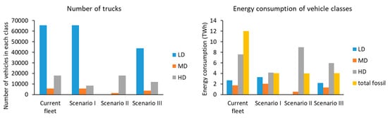 Calculations of the vehicle class scenarios were based on the current number of trucks and average mileages (Table 2) as well as the average energy consumption calculated for each vehicle class. The energy consumption of biomethane fuelled trucks per vehicle class Equation (4) with the assumed 18% lower efficiency [11] would result in 257 kWh/100 km (LD trucks), 454 kWh/100 km (MD trucks) and 675 kWh/100 km (HD trucks). The numbers of trucks in each class and the respective average energy consumption for the examined scenarios are presented in Figure 2 and compared to the current heavy-duty transport vehicle fleet.