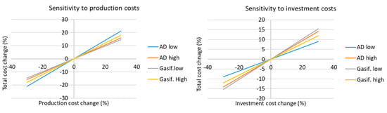 The sensitivity analysis showed (Figure 3) the costs of biomethane to be more sensitive to the investment costs than the production costs. In addition, the investment costs will likely decrease rather than increase with more frequent installations. However, one must bear in mind the dependence of production costs on feedstock costs [37]. Finally, the examination of the slope of sensitivities indicates how changes, for example in the chemical engineering index, or interest costs may also affect costs, yet these effects cannot be estimated in detail within the scope of this study.