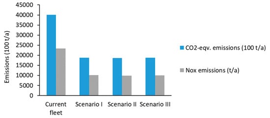 The total CO2-equivalent emissions and NOx emissions for the scenarios examined (Figure 4) were calculated on the basis of average emissions for each vehicle class (Table 4), with the limitations discussed in Section 2.3. For scaling purposes, the CO2 emissions (Figure 4 are presented as 100 t/a.