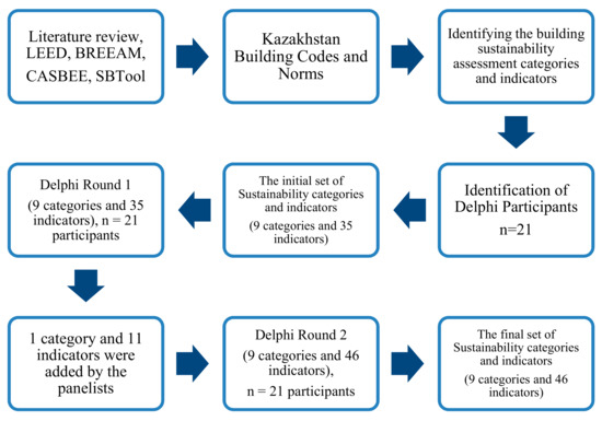 The study adopted a qualitative approach to identify the assessment categories and assessment indicators for commercial buildings’ sustainability in Kazakhstan. Literature review and Delphi technique were used as the main data collection sources. Two sets of assessment categories and indicators, initial and final, were developed. The initial set of assessment categories and indicators were identified based on the review of well-recognized assessment tools. The review attempted to focus on the elements of these tools and their implementations; and considered the local context of Kazakhstan in terms of the climatic and regional diversification, and project implementation peculiarities of the construction industry in Kazakhstan. A Delphi questionnaire survey was conducted to collect the information from the Architectural, Engineering and Construction (AEC) experts in Kazakhstan and to validate the final set of identified assessment categories and indicators. The main goal was to ensure the importance of each assessment item and its applicability to Kazakhstan’s local context. Parameters of the assessment indicators are determined based on the National Building Codes requirements and with the industry experts’ assistance. Statistical aggregation of questionnaire results was performed using SPSS software. The research design structure is illustrated in Figure 1.