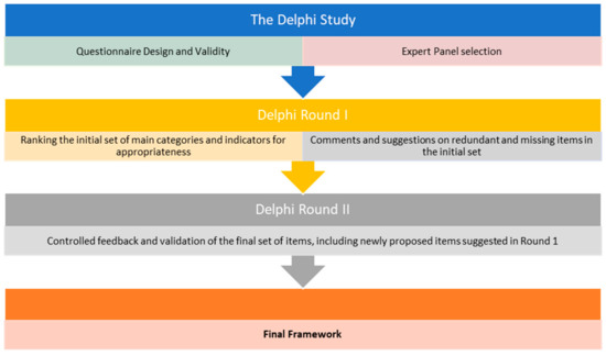 A questionnaire was developed after the assessment categories and indicators were determined. Mostly, two to three rounds of Delphi survey are sufficient to achieve consensus among invited participants [44]. According to Skulmolski et al. [45], a 3-round Delphi study is the most appropriate for graduate research. Nevertheless, in the course of the research, it took much time to get the point of second round, and panelists were reluctant to continue after an agreement was achieved. The mean values were set at 75% (>3.80). Thus, it was decided to finish the study at the second round. Moreover, from other studies, it was observed that surveys are typically concluded within two rounds [46,47].