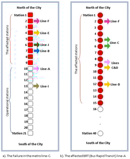 On Friday 3 March 2017, at about 18:19 h, a metro track failed prompting about 50% of the metro system line-C to a halt (Figure 1a and Figure 2). The incident occurred at rush hour when tens of thousands of commuters were heading to their homes after work [38]. Soon after the track incident, (18:20–19:35 h), it is believed that some of the metro trains were instructed to decrease the traveling speed, others to stop in the stations, and some of them stopped in between stations (tunnels); the commuters were angry and finally were instructed to evacuate through the tunnels. It is thought about 45,000 commuters were affected by the transport disruption [38].