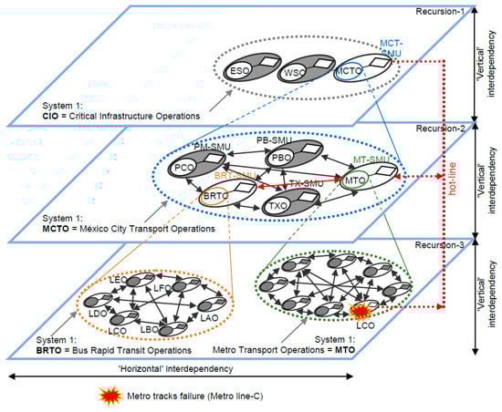 Once the capital city’s modes of transport network were identified, the next step was to model the recursive structure of the transport network. In the SSMS model, the concept of Recursion, helps us to see how the systems of interest are interconnected (i.e., “Recursion means that every ‘system’ contains, and is contained in, a ‘system’” [33]). Figure 3 shows three levels of Recursion for the transport system. For instance, Recursion 1 (or level 1) contains the system of our interest, i.e., MCTO (Mexico City Transport Operations) and its associated safety management unit (SMU), MCT-SMU (Mexico City Transport-Safety Management Unit). (It should be mentioned that at this level, other critical infrastructures were considered to illustrate, for example, that each of these could be, in principle, de-composed and analyzed, i.e., ESO (Energy Supply Operations), WSO (Water Supply Operations). However, these were not affected during the disruption, and therefore not considered in the present analysis.