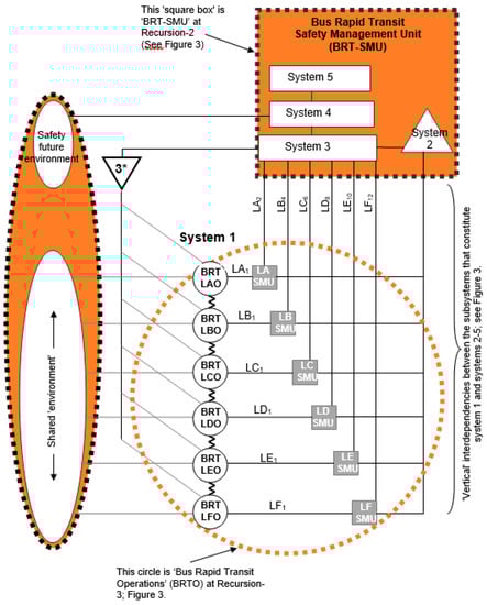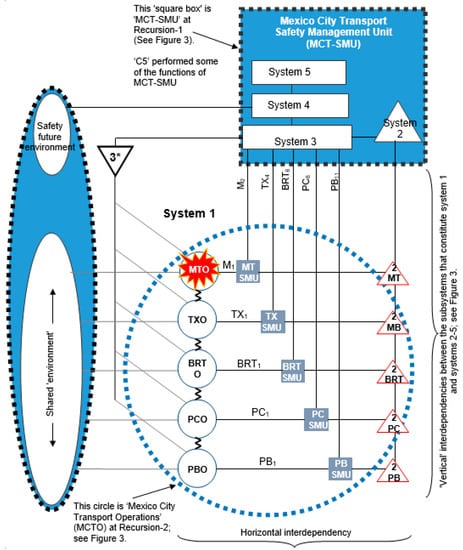 “Overall, System 2–5 facilitate the function of system 1, as well as ensuring the continuous adaptation of the systems as a whole, i.e., (the ‘México City transport system’). System 2–5 are described briefly in what follows: System 2, safety coordination, ensures that the various operations of System 1 operate in agreement. System 3, safety functional, ensures that System 1 implements the organization’s safety policies. System 3*, safety audit, is part of System 3 and it is concerned with safety sporadic audit. System 4, safety development, is responsible for identifying strengths, weaknesses, threats, and opportunities that can suggest systemic changes to the organization’s safety policies. System 4*, safety confidential reporting, is part of System 4 and it is concerned with confidential reports or causes of concern that may require direct and immediate intervention of the corporate management. Finally, System 5, safety policy, is responsible for establishing safety policies for the system as a whole” [34].