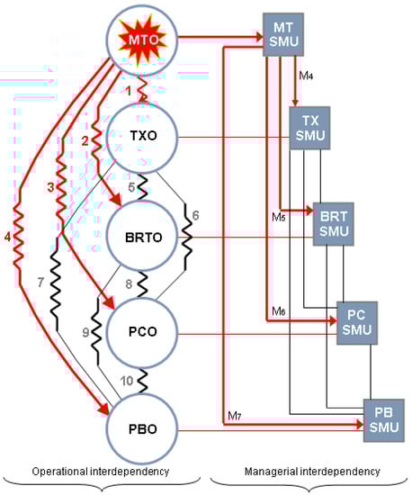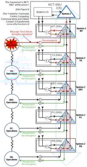 Effectively, the transport system is exceedingly complex and highly interconnected. As mentioned in Section 4.1.1, any deviation from an accepted criterion (e.g., a track failure), the failure propagated in both directions vertically and horizontally (Figure 3 and Figure 6). Further, if these disruptions are not controlled, then by now we should be very familiar with the consequences in terms of property/human/economic losses [3,4,50,56,57]. In the SSMS model, System 2 deals with the co-ordination function explicitly (see the triangle shaped symbol within the big square box in Figure 4, Figure 6, Figure 7 and Figure 9). That is, the function of System 2 is to coordinate all the activities of the subsystems that form part of System 1 (e.g., MT-SMU, TX-SMU, BRT-SMU, PC-SMU, and PB-SMU, each with their associated operations (circles), as shown, for example, in Figure 6).