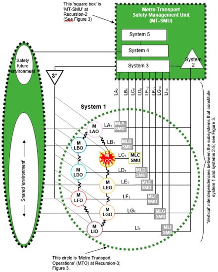 In general, the ‘Systemic Safety Management System’ (‘SSMS’) model aims to maintain risk within an acceptable range in the operations, in principle, of any system. If the features of the model (i.e., System 2–5) are in place and working effectively then the probability of failure should be less than otherwise. In this way the systemic model has a fundamentally preventive potentiality. A full account of its features and applications are given elsewhere [14,27,28,29,30,31,32,33,34,35,36]; in the present case study, the ‘structural organization’ and the ‘recursive’ structure of the model were employed in the analysis. Regarding the ‘structural organization’ (Figure 4):