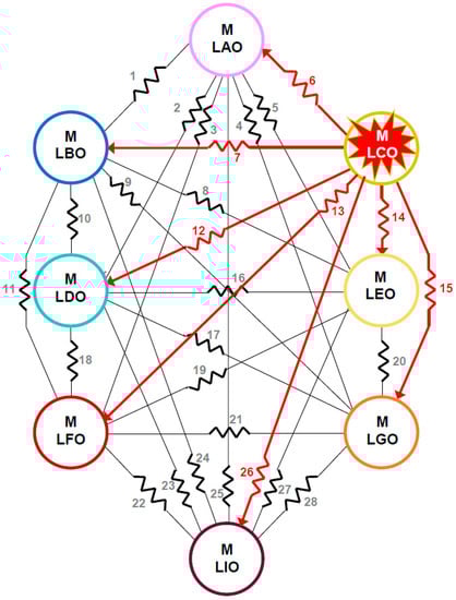Before discussing in some detail of the functioning of the coordination function (System 2), it may be necessary to understand how the failure propagated through the total transport system. In our case study, at the level 3 (or Recursion 3) in Figure 3, the disruption originated in the metro line-C operations (MLCO) and from there it affected the whole transport system, i.e., first, it affected the metro line-C operations (Figure 1a); second, it affected the other metro lines intersecting the metro line-C (e.g., MLAO to MLIO, as shown in Figure 8); third, the disruption spread vertically to Recursion 2 (or level 2), i.e., MTO, TXO, BRTO, PCO, and PBO, each with their associated SMUs (square boxes), as shown in Figure 3 and Figure 4; fourth, if uncontrolled, it would affect other critical infrastructures at Recursion 1, i.e., ESO (Energy Supply Operations), WSO (Water Supply Operations), etc. In short, the failure propagates horizontally (at every level of Recursion) and vertically (between levels of Recursion), as shown in Figure 3.