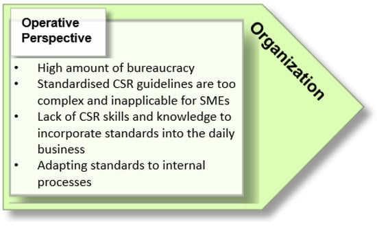 Challenges at the operative management level, summarized in Figure 5, underline that CSR standards may still be too complex for SMEs to implement [] (p. 59), [] (p. 727). Nevertheless, according to the European Union, even before the publishing of the adapted implementation processes of both standards, the standardized ISO and EMAS were already being implemented by some SMEs [] (p. 726). This contradiction leads to the question why some SMEs face challenges on the operative management level when integrating CSR practices into their business strategies, whilst others do not and how SMEs can overcome or avoid these challenges.