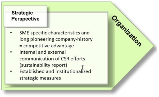 SMEs have however, specific characteristics which greatly differentiate them from large companies [] (p. 41). The SMEs limited resources—such as budget, revenues or number of employees—are often referred to as a reason why SMEs tend to have limited divisional structures [] (p. 242), [] (p. 182). Due to the smaller number of employees, these have to take multiple functions within the organization, which is why SMEs often lack specific specialists [] (p. 242), [] (p. 182). Literature claims that within a company, regardless of its size, key players such as managers and a company’s owner(s) have a strong influence on the firm’s strategy; due to the small size of SMEs the influence of these key players on the company’s strategy is more marked [] (p. 184). Additionally, a limited budget means simpler capital structures and it creates a necessity for SMEs to rely on their networks of personal relations and the firm’s reputation to compensate their limited resources [] (pp. 183–185). External networks provide SMEs with missing knowledge and resources, compensating for their own limited capacity [] (p. 172). One further characteristic of SMEs, essential for this study, is the relatively limited level of visibility of the companies. SMEs receive significantly less attention from the media compared to large firms, meaning their actions are less exposed to the changes in public opinions and values [] (p. 185).