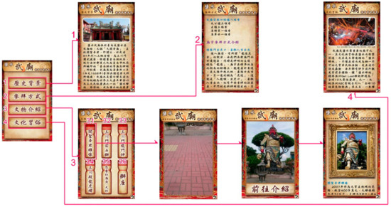 Click the application interface button to get access to interactive pages. There would be buttons showing up down below the screen. After scan objects in the temple field, by clicking the buttons to get into the Guan-Gong introduction information with AR effect. Contents of the interface in the workflow of Figure 1 are described as Table 1 and Table 2.