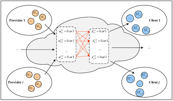 In this research, the CMfg platform with client-centered operating mode is taken into account, where clients’ interests become the optimization objectives. When a client’s request is submitted to the CMfg platform, it usually needs to be allocated to different service providers through three steps: task decomposition, service discovery and matching, service selection and scheduling (SSS). The abstract model of SSS in CMfg is shown in Figure 1 [14]. Suppose that within a certain decision period, there are enterprises and tasks on the CMfg platform. Here, we use to represent the enterprise set, and to represent the task set. Different enterprises provide different kinds of services, for example, enterprise provides kinds of services, so it’s service set is expressed as . Each task could be decomposed into multiple subtasks, for example, task could be decomposed into subtasks, so it’s subtask set is expressed as . In the SSS process, each subtask is assigned to one available service by and , both of which can only be 0 or 1. Firstly, the value of is determined in service discovery and matching process, then treated as a known parameter in SSS process. If service has the ability to perform subtask , then ; otherwise . Secondly, we need to select the value of in SSS process. If subtask is indeed assigned to service , then ; otherwise . For instance in Figure 1, is used to determine whether service is capable of executing subtask , and is used to determine whether subtask is allocated to service .