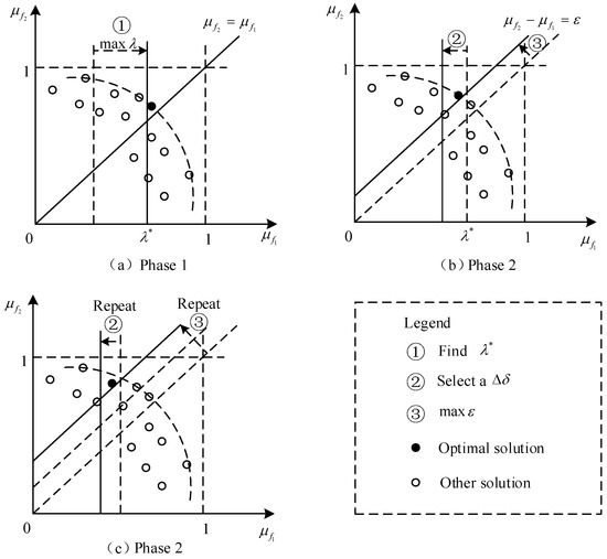 The FGP method is advantageous to consider from the whole point of view, and its objective is expressed in Equation (16). Unlike the Max–min method, this method maximizes the total satisfaction of the objectives, and makes the objective which is easy to improve the satisfaction better satisfied. In addition, DM’s preference is taken into account, and only solutions satisfying priority satisfaction are selected. Similarly, this method is also implemented by GA algorithm, except that only solutions satisfying constraint (15) would be used to compute value.