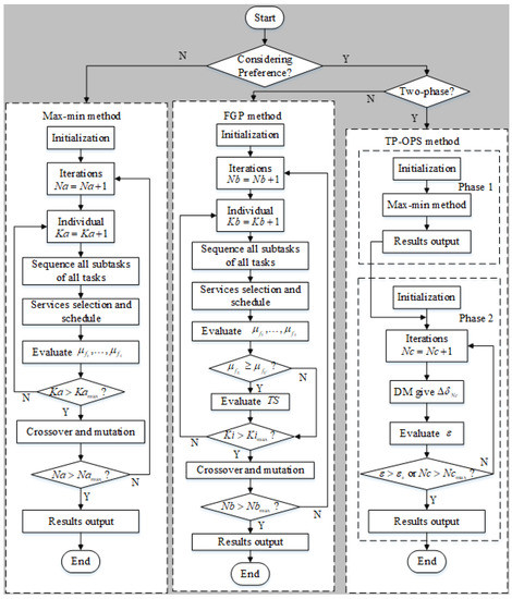 As mentioned earlier, the tasks that this paper focuses on are all complex tasks. Each complex task must be decomposed into a few simple subtasks that can be executed by existing resource services. The SSS model described in Section 3.1 considers not only DM’s priority preferences, but also the optimization of all tasks from a client-centered perspective. In order to solve the proposed model, we developed the TP-OPS method. In this subsection, the detailed steps will be introduced, while two other methods, the max–min method and the FGP method, will also be introduced for comparison. Figure 3 shows the framework of the three methods.
