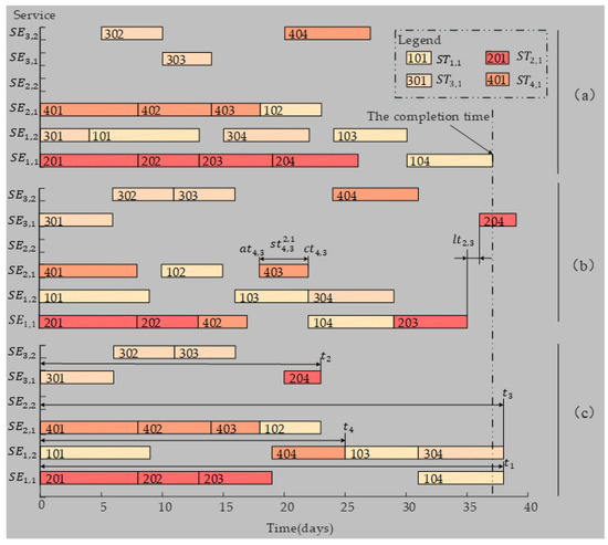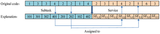 This individual (23) expresses a service order of 4 tasks on 3 enterprises, where each task has 2 subtasks and each enterprise has 2 services. In individual (23), the first 8 bits indicate the order of the task, which is task 1-3-3-4-2-2-1-4; Bits 9 to 16 represent the services, which is 2-3-1-4-2-5-6-3. For easy representation in figures, we also use 302 to represent , and the same is true for other subtasks. Then the order 1-3-3-4-2-2-1-4 indicates that the sequence of task execution is 101-301-302-401-201-202-102-402, shown in Figure 4.