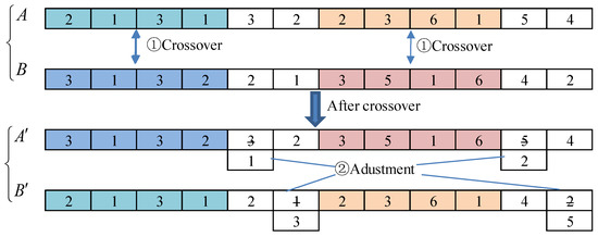 The integer crossover method is used for crossover operations. First, two chromosomes are randomly selected from the population, and the first bits of each chromosome are taken out, and then the intersection positions are randomly selected. After the crossover, the subtasks of some tasks are redundant or missing. Therefore, it is necessary to adjust the redundant subtasks to the missing subtasks and adjust the corresponding services. The crossover operation is shown in Figure 5.