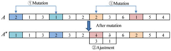 The mutation operator first randomly selects an individual from the population, then randomly selects two mutation bits, and finally exchanges the two subtasks and the corresponding service numbers in the individual. If the modified chromosome does not meet the requirements, adjustments are performed on it. The mutation operation is shown in Figure 6.