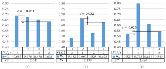 In addition, satisfaction , priority variable and total satisfaction of the above three schemes were calculated separately and shown in Figure 8. From this figure, we can see in (a), which means that the satisfactions does not meet priority order 3-1-2-2, and in (a) is the largest of all methods. In Equation (16), the objective function of the FGP method is to maximize . However due to the priority requirement, in (c) is less than in (a). Compared with (a) and (c), in (b) achieves the maximization of differences in satisfaction between objectives with different priority. Therefore, the results of both TP-OPS method and FGP method can satisfy the priority constraint, but the max–min method could not. In addition, in the case of fixed , TP-OPS method can obtain larger than FGP method. If iterated, TP-OPS method may also achieve a larger . When DM wants to be larger, then TP-OPS method will be more suitable.