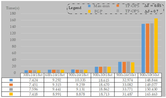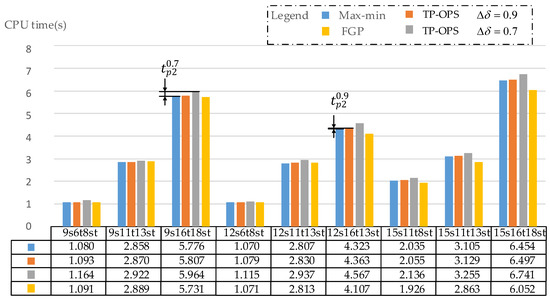 In terms of , the FGP method has an advantage because its objective function is to maximize . For three methods, and are summarized in Table 13. It can be seen from this table that for most combinations, of FGP method is still the largest of the three methods, although an exception has occurred for combination 12s6t8st. This phenomenon that of FPG method is smaller than the max–min method in some individual case (which can also be seen in Figure 8) is mainly due to the influence of the constraint (15). Both TP-OPS method and the max–min method focus on maximizing without paying attention to the highest priority objective, so it is not easy to make individual satisfaction particularly high like FGP method shown in Figure 3c. In addition, compared to the max–min method, TP-OPS method performs the optimization of phase 2 according to Equation (20), which further affects .