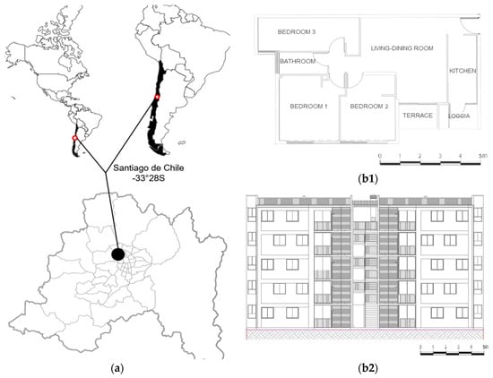 The samples used in the study are apartments located in three groups of social housing. Each apartment has an area of 56.97 m2, with living-dining room, bedrooms, kitchen, bathroom, utility room, and terrace (Figure 1b1). There are 18 reinforced concrete buildings, each one 13.65 m high and composed of five floors (Figure 1b2) with four apartments per floor