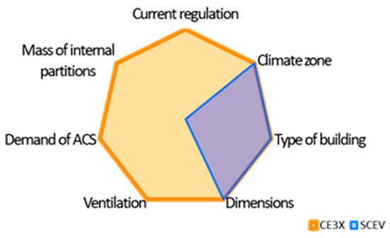 A comparison with quantitative and qualitative variables was established when both energy evaluation systems were compared in buildings. The qualitative variables are related to the input, modeling and output parameters of each HC, and to outline them the Spanish parameters are defined as the total to be obtained (as a reference), being represented in each of the graph vertices. Similarly, the quantitative variables are shown by box plot comparisons regarding the values of energy demand, consumption and CO2 emissions according to each HC.